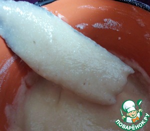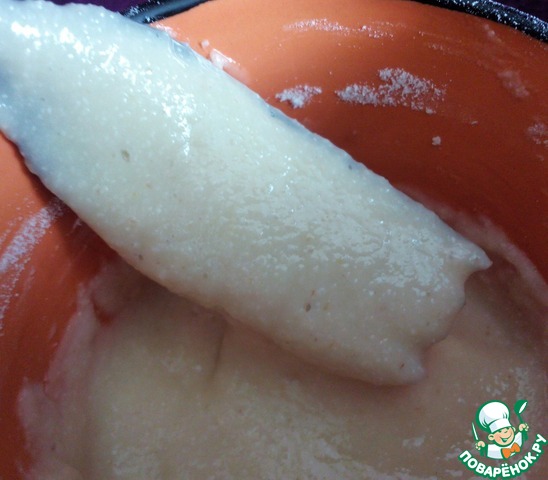 • Добавить сахар, манку и разрыхлитель. В конце кладем муку и хорошо перемешиваем