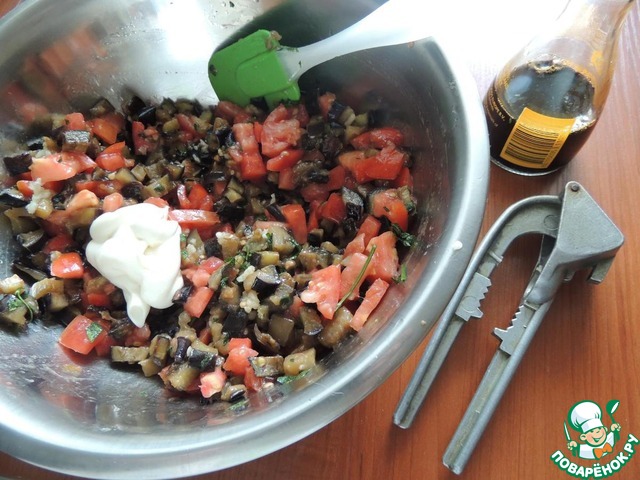 Соединить баклажаны с помидорами, добавить чеснок, зелень, майонез и соевый соус. Аккуратно перемешать.