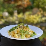 Капусту я использовала замороженную. Приготовить ее очень просто в микроволновой печи, поместив в специальную форму. У меня печка не самая мощная, по моему 850, приготовление занимает 8 минут. После приготовления обдать холодной водой, чуть измельчаем. Впрочем, размер кусочков на Ваш вкус.