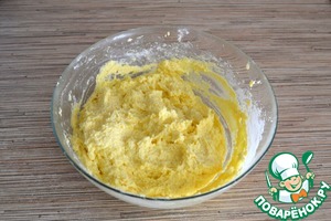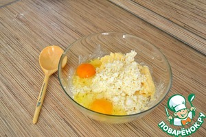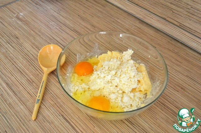 Добавить яйца, гашеную соду, ванилин на кончике ножа, творог.