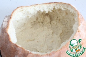 Отрезаем верх, достаем мякиш, оставляя стенки.