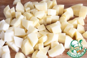 Картофель кубиками. Нарезка по размерам у овощей на ваше усмотрение, но не стоит сильно мельчить.