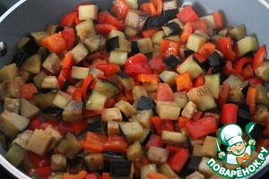 На одной сковороде на небольшом количестве растительного масла почти до готовности обжариваем баклажаны и перец.