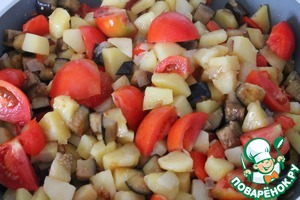 Все смешиваем в одной сковороде. Добавляем помидоры, разрезав их на 4 части.