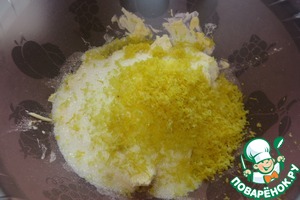 В глубокую миску нарезать кусками мягкое масло, лимонную цедру и 200 гр сахара