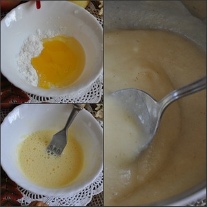 Яйцо взбиваем с крахмалом. Яблочное пюре ставим на небольшой огонь и тонкой струйкой вливаем взбитое с крахмалом яйцо. Постоянно помешивая, доводим пюре до загустения и снимаем с огня. Даем яблочному пюре слегка остыть.