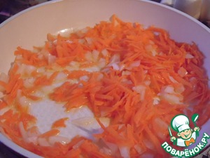 Лук мелко нашинковать, морковь натереть на крупной терке. Подготовленные овощи обжарить на растительном масле 2-3 минуты.