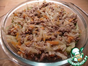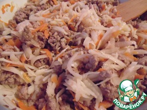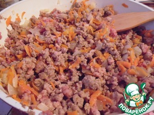 К овощам добавить фарш, обжарить, разбивая комочки, 4-5 минут.