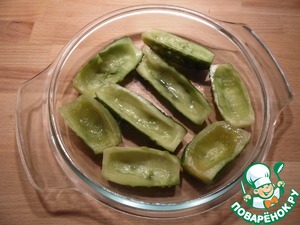 Соленые огурцы разрезать пополам, ложкой выбрать середину, сделав лодочки. Выложить их срезом вверх в жаропрочную посуду для микроволновки.