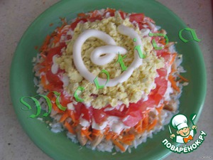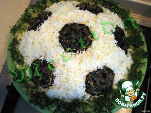 Увидела в "Школе Гастронома" фото тортика в виде Футбольного мяча, ну кто же смотрит футбол с тортиком? Вот лучше к пиву подойдет такой салатик. Немного риса, кусочки жареной курочки, помидорчик, морковочка, яйца, маслинки, много сыра, чесночек, зелень, ну и майонез.