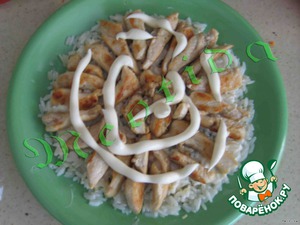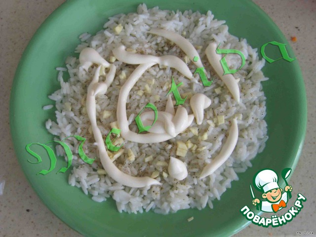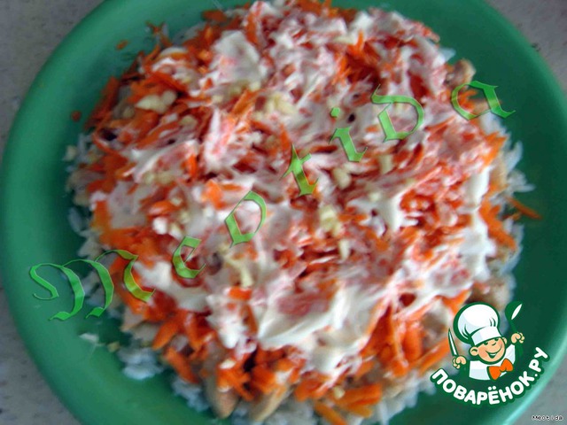 Выложить слой риса и поперчить, смазать майонезом и немного чесночка.