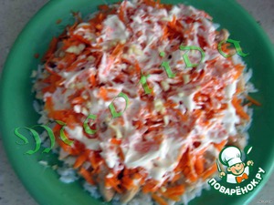 Сыр натереть на терке, смешать с майонезом и покрыть весь салат тонким равномерным сырно-майонезным слоем.
