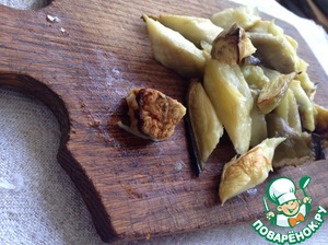 Готовые баклажаны остудить, очистить от шкурки. Мякоть баклажанов порубить не очень мелко.