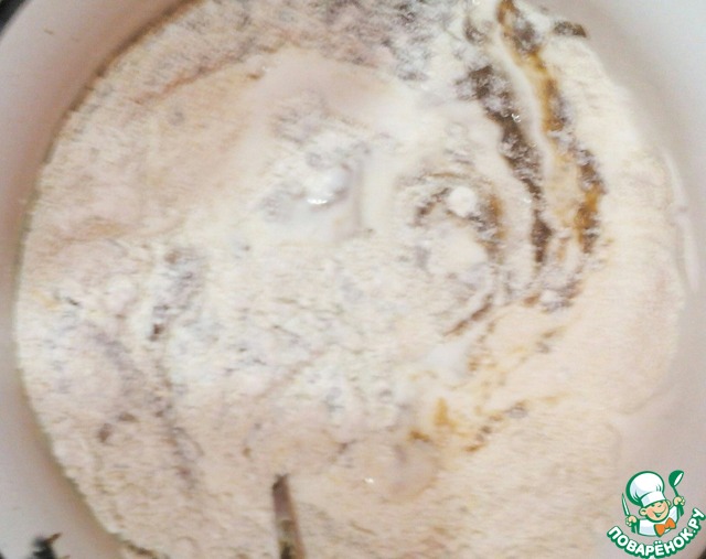 Просеять муку, смешать с овсяной мукой, разрыхлителем