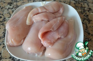 1. Разогреть духовку до 200. Обрезать жир с грудки. Сделать надрезы, чтобы получился кармашек.