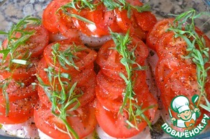 5. Смазать форму для запекания оливковым маслом. Выложить куриные грудки, каждую накрыть ломтиками помидора и несколькими веточками эстрагона. Посолить и поперчить. Сбрызнуть оливковым маслом. Запекать 25-30 минут. Подавать курицу холодной или горячей с салатом и хлебом.