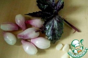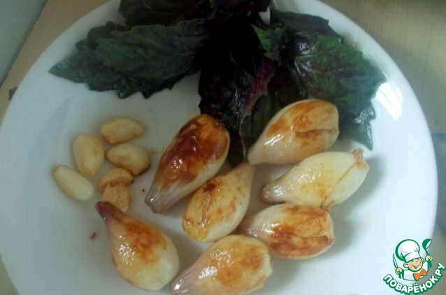 Через минут 10, когда мясо станет золотистым, вынуть его и отправить в посуду для запекания в микроволновой печи. Лук и чеснок обжарить на том масле, в котором жарилось мясо, до золотистого цвета.
