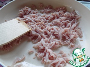 Ветчину натереть на крупной терке, обжарить на сливочном масле 2-3 минуты.
