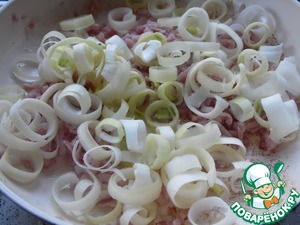 Лук-порей нарезать колечками, добавить к ветчине, обжарить 2-3 минуты.