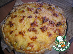 И густо посыпаем пирог сверху. Сыр Гауда хорошо плавится.