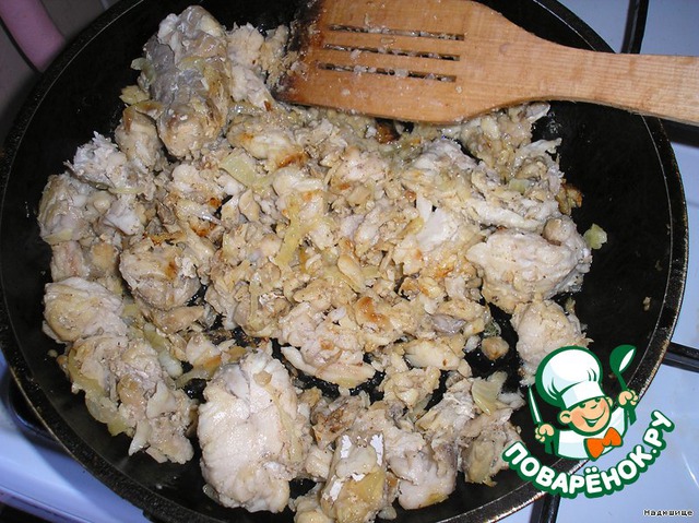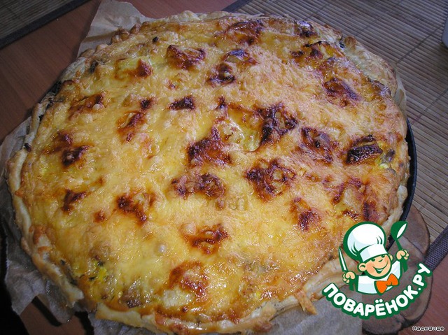 Берем круглую форму или просто небольшую по объему, устилаем бумагой для выпекания и смазываем растительным маслом. Кладем в нее слоеное тесто так, чтобы края были выше начинки. Поджаренную рыбку с луком выкладываем на тесто.