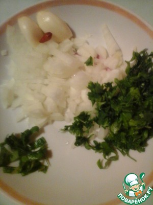 Уложить помидоры в кастрюлю, добавить мелко нарезанный лук, перец, чеснок, зелень петрушки и мяту. Влить оливковое масло и посолить.