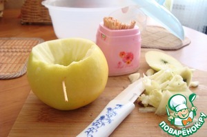 Приготовили яблоко для запекания. Вовнутрь положили 1 ч л творога мягкого, 1 ч л овсяных хлопьев и опять творог.