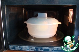 Ставим в СВЧ на MAX мощность (у меня 800 W) на 2 минуты. У меня есть кастрюлька для СВЧ с крышкой. Можно поставить в любую посуду пригодную для СВЧ и накрыть колпаком. Можно и без колпака.