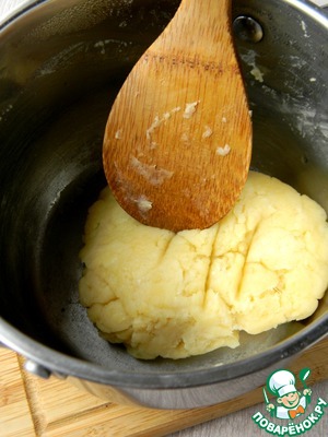 В кастрюле вскипятить воду с маслом, когда масло полностью растает, высыпать муку и быстро перемешать до однородности. Убрать с огня.