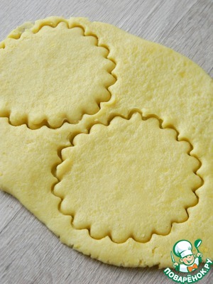 Песочное тесто раскатать, стаканом или формочкой вырезать основу будущего пирожного. Тесто очень нежное, поэтому можно сразу вырезать на бумаге для выпечки, чтобы потом сразу переложить на противень. Из этого количества теста получилось 4 шт.