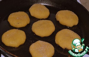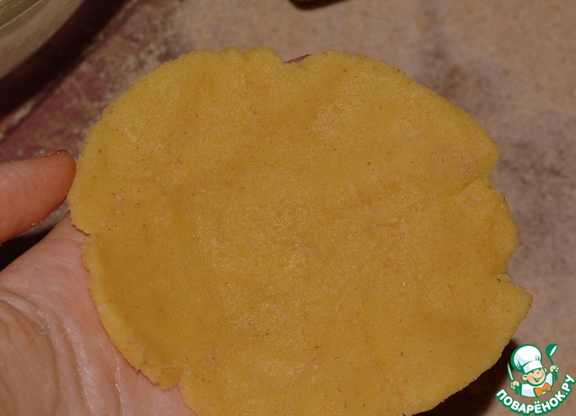 В центр кружка выложила начинку, завернула края в центр и швами вниз опустила на сковороду в масло.