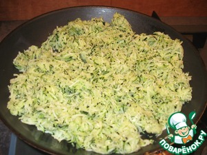 Отжимаем их хорошо от жидкости. Растапливаем 20гр. сливочного масла на сковороде и обжариваем в нем наши отжатые кабачки около 7-8 минут.
