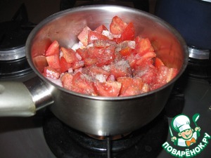 Для соуса, кладем лук и томаты в кастрюльку, солим, перчим. Наливаем 100 мл. воды и отвариваем на медленном огне 7-8 минут.