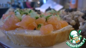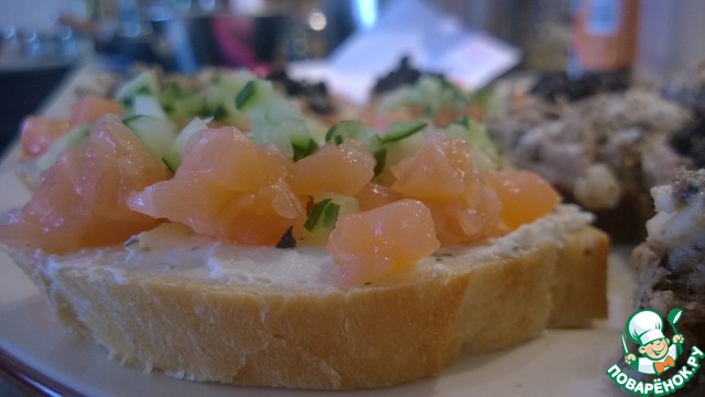 На багеты намазываем сыр, сверху выкладываем семгу и огурцы. -