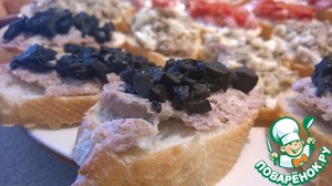 Намазываем паштет на багеты и сверху выкладываем нарезанные оливки.