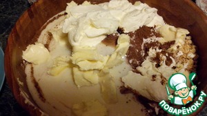 Добавить сахарную пудру, какао, сгущенку, мягкое масло и сметану