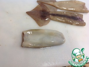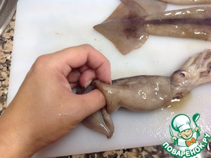 Очистить от внутренностей, вынуть поперечную кость, промыть, отрезать от головы щупальца.