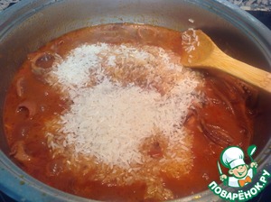 Затем добавляем томат и 2 стакана воды, убавляем огонь, солим и перчим по-вкусу. Закрываем крышкой и оставляем тушиться на 30-40 минут.