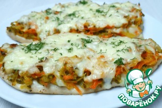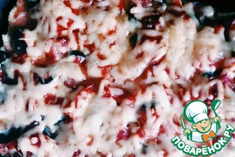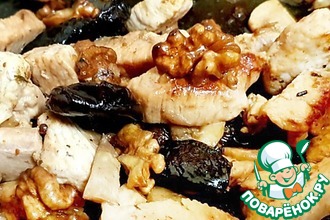 Кладем сверху кусочки куриного мяса, закрываем фольгой, и отправляем в разогретую до 190 - 200 градусов духовку, на час и 30 - 40 минут.