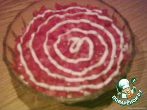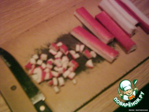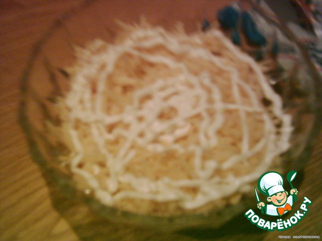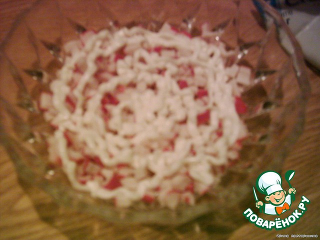 И выкладываем сверху на крабовые палочки, полить майонезом.
