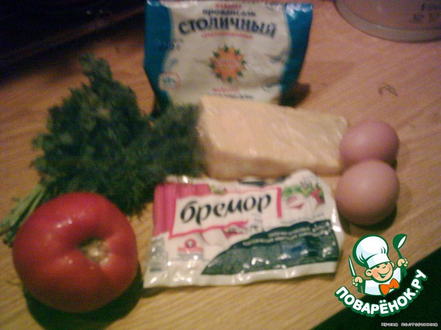 Приготовить продукты для салата - крабовые палочки, помидоры, сыр, отварные яйца, майонез, укроп и петрушку.