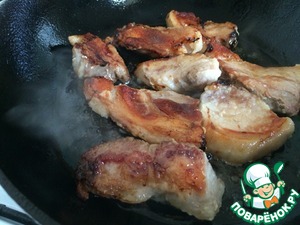 На очень раскалённую сковородку выкладываем наше мясо и жарим до золотистой корочки (буквально по полторы минутки). Все мясо за раз не жарим!!! а то оно пустит сок и начнёт тушиться, а не жариться.