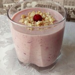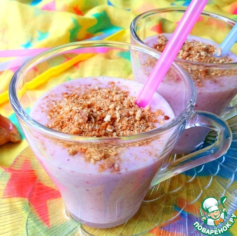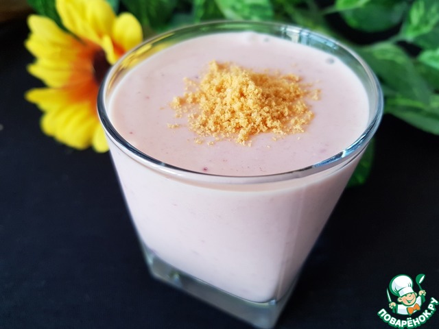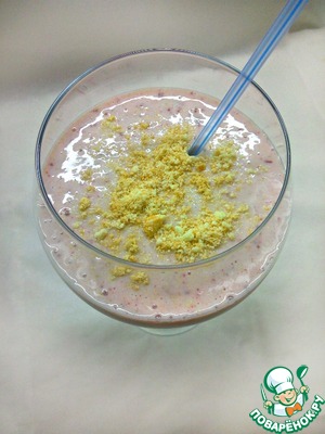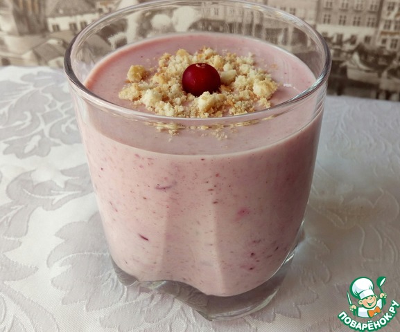 В стакан налить смузи, добавить оставшиеся пол ложки клюквы. Печенье растереть в крошку и посыпать этой крошкой смузи. Наслаждаться немедленно!