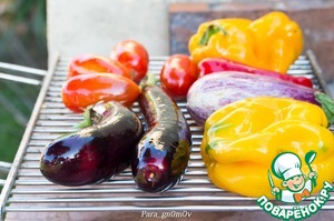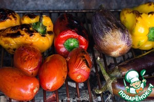 3. Запечь овощи до появления черных подпалин. Овощи поместить в пластиковый пакет, дать им немного отдохнуть (в этом случае кожица снимается очень легко), очистить от кожицы и плодоножки, у перца также удалить семена. Овощи нарезать крупными кусками. Перец стараться резать и извлекать плодоножку с семенами очень осторожно, чтобы сохранить образовавшийся внутри сок. Этот сок добавить к овощам, он придаст дополнительную сочность и вкус. Запекать овощи можно как непосредственно на углях, так и в разогретой до 190 градусов духовке.