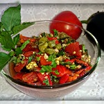 4. Орехи, базилик (листья) и зелень мелко нарезать. Можно добавить в салат каперсы, но это дело вкуса. Перемешать овощи с зеленью, заправкой, посыпать орехами. Дать настояться 10-15 минут и подавать.