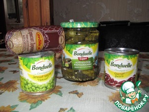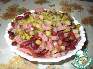 Колбасу нарезаем соломкой. Огурчики у нас маленькие, поэтому берем штук 6, можно порезать кубиками или соломкй как больше нравится. Идеально подходят огурчики Коррадо, они остренькие и в них не много уксуса. Смешиваем колбасу, огурцы, фасоль и горошек. Если на двоих то подходят маленькие баночки горошка и фасоли, если для гостей то лучше взять большие.