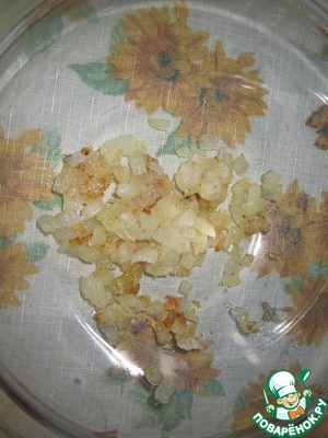 Берем маленькую луковичку и обжариваем до золотистого цвета. Сдвинем лук на край сковородки и ставим с уклоном чтобы масло немного стекло. После того как лишнее масло стекло смешиваем с остальными ингредиентами.