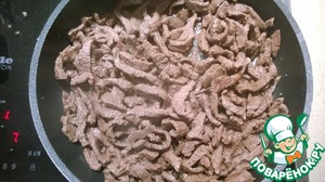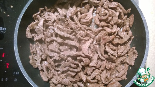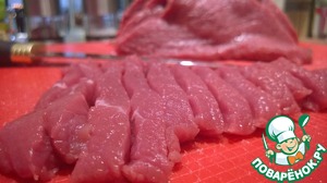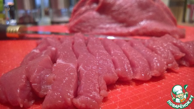 Я еще немного отбиваю тонкие ломти говядины и только потом нарезаю их соломкой. Мясо готовится очень быстро.