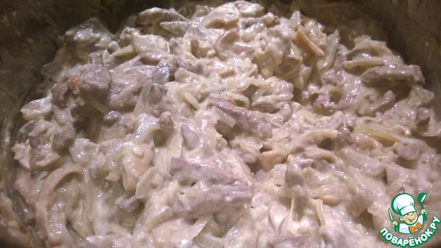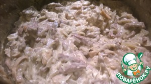 Затем перекладываем мясо в грибную смесь, добавляем соус.