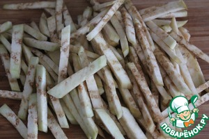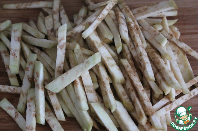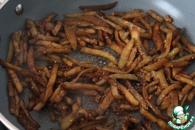 Баклажаны обжариваем на растительном масле. Добавляем соевый соус Kikkoman и немного молотого чеснока.